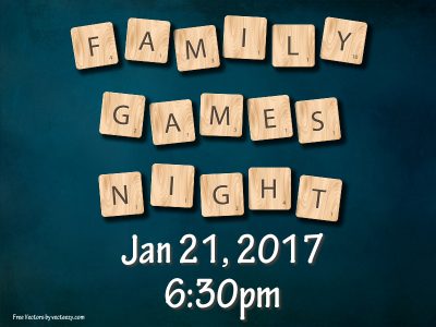 We invite you to join us on Jan. 21, 2017 from 6:30-9:30pm for our 3rd Family Games Night.